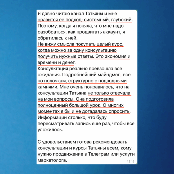 «Не вижу смысла покупать целый курс, когда можно за одну консультацию получить нужные ответы. Это экономия и времени, и денег. Я сразу применила знания на практике и получила результат, который реально превзошёл все ожидания»