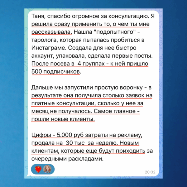 2️⃣ Клиент получил заказы на 30 000 рублей, причём это только начало — новые клиенты будут возвращаться за повторными раскладами